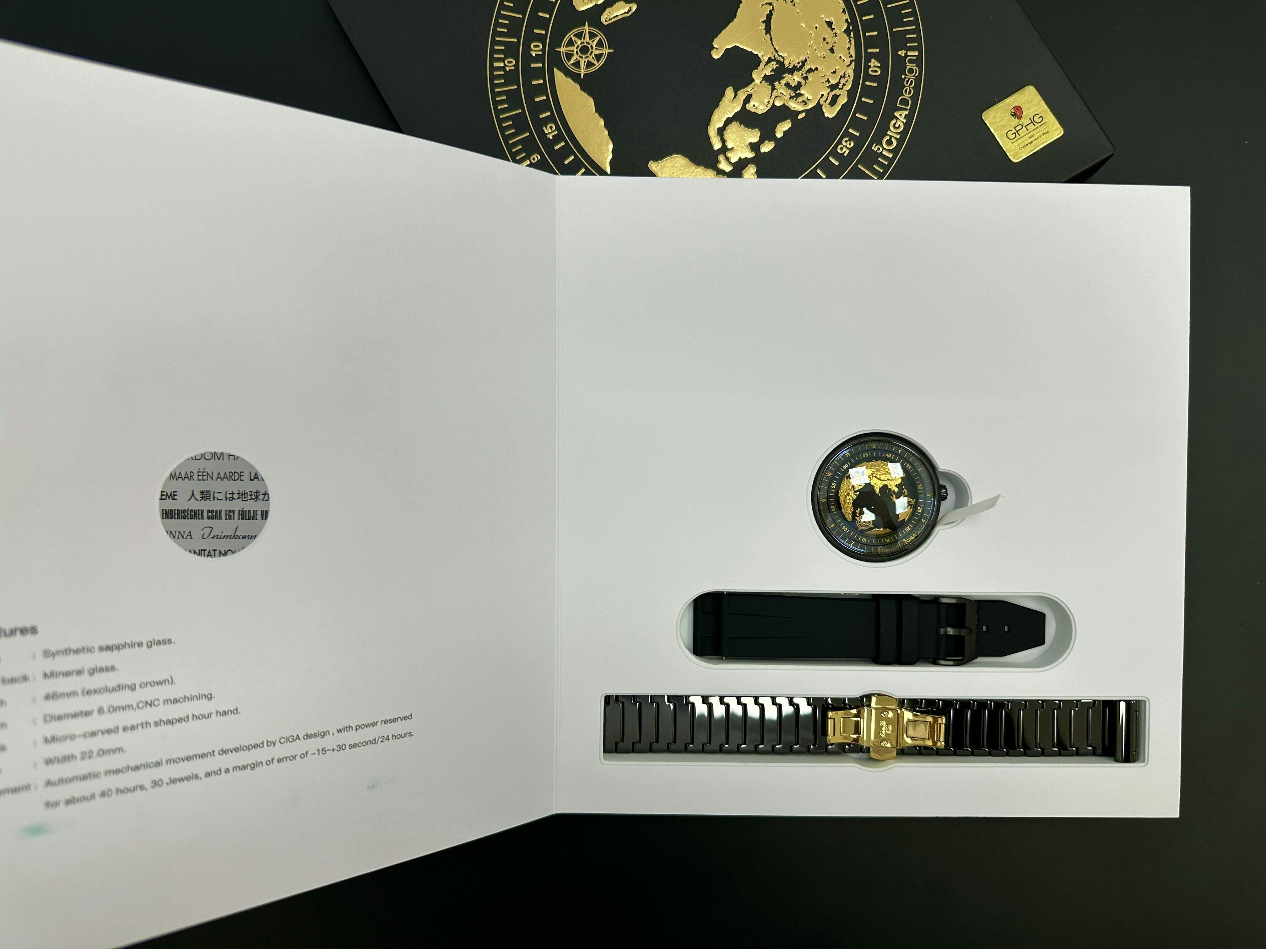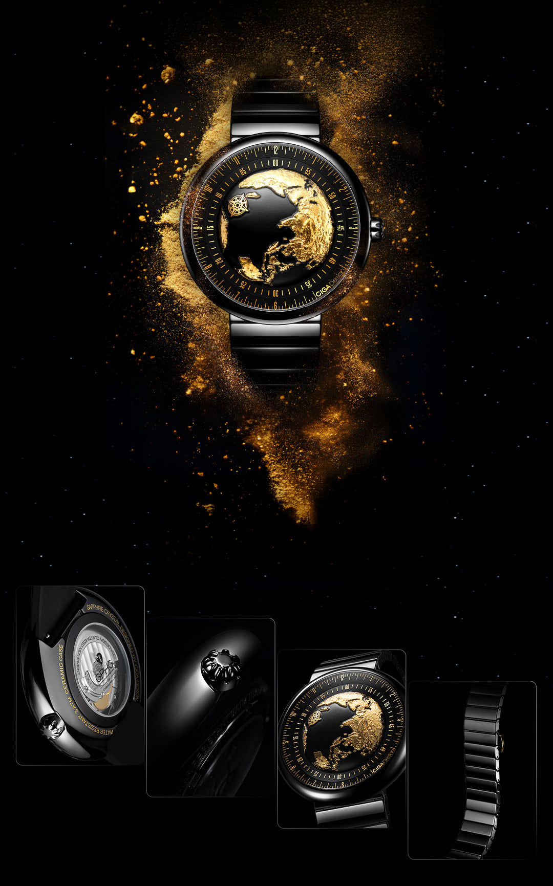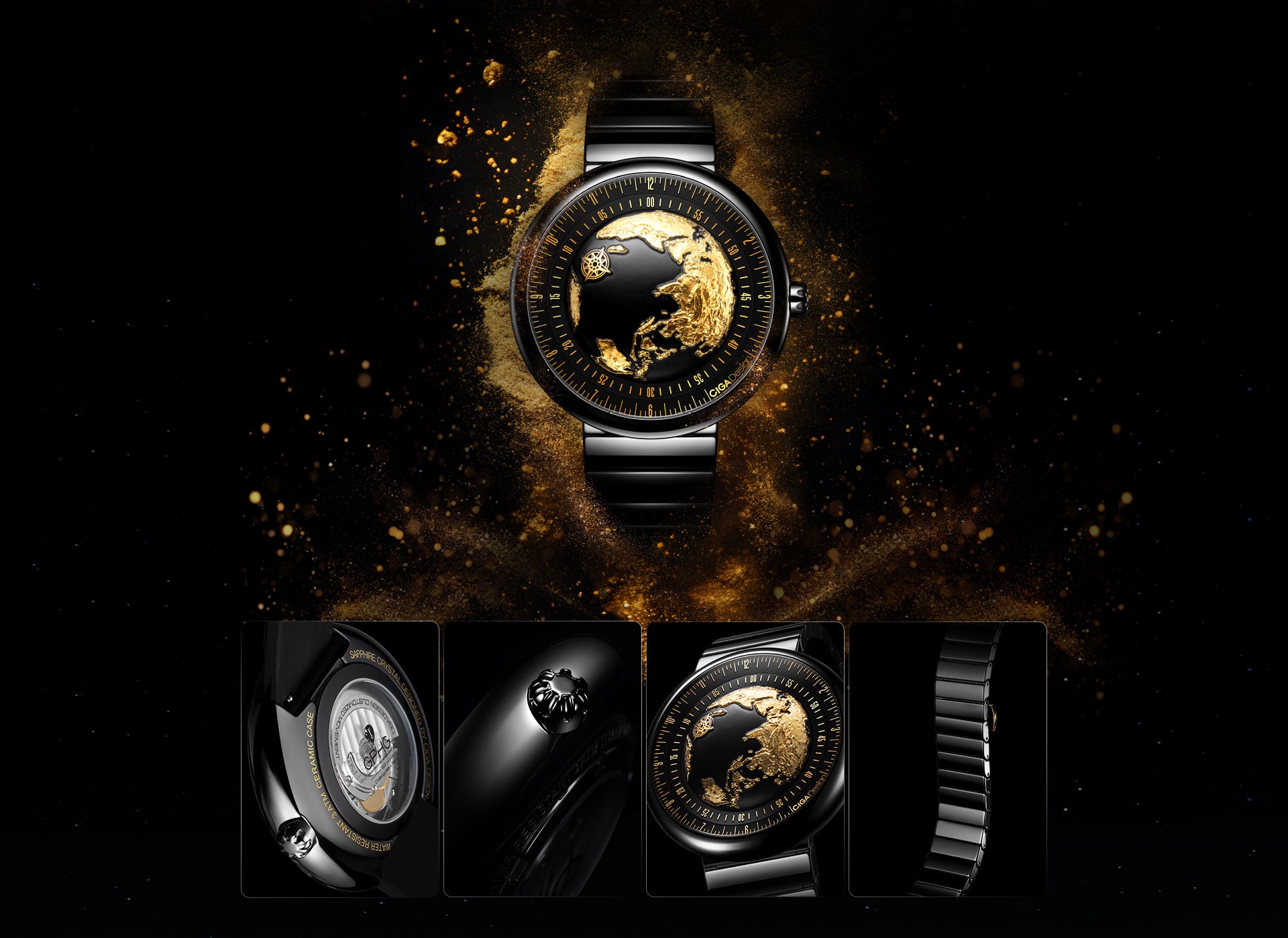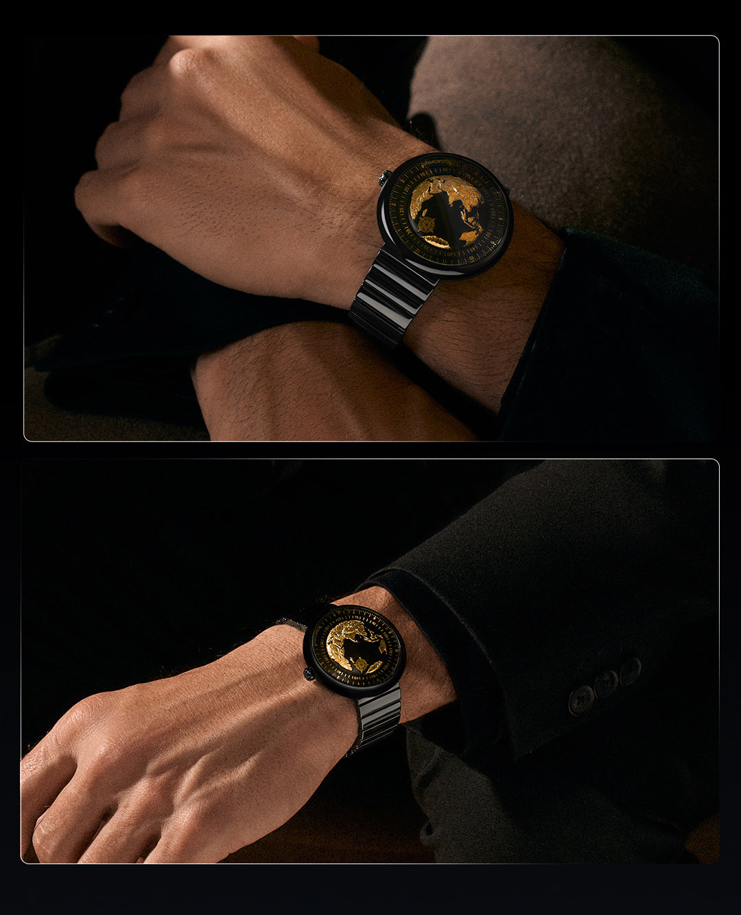 **Design e Materiali:** Con la sua cassa in ceramica raffinata, il quadrante dorato e i dettagli minuziosi, questo orologio è un pezzo d'arte al polso. L'intricato quadrante, realizzato con micro-incisioni e doratura multi-strato 24K, riproduce la Terra con un rapporto continente-oceano realistico.