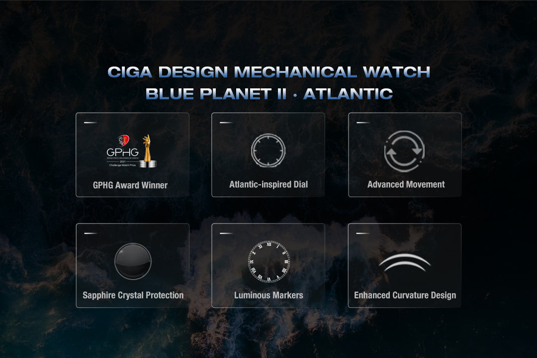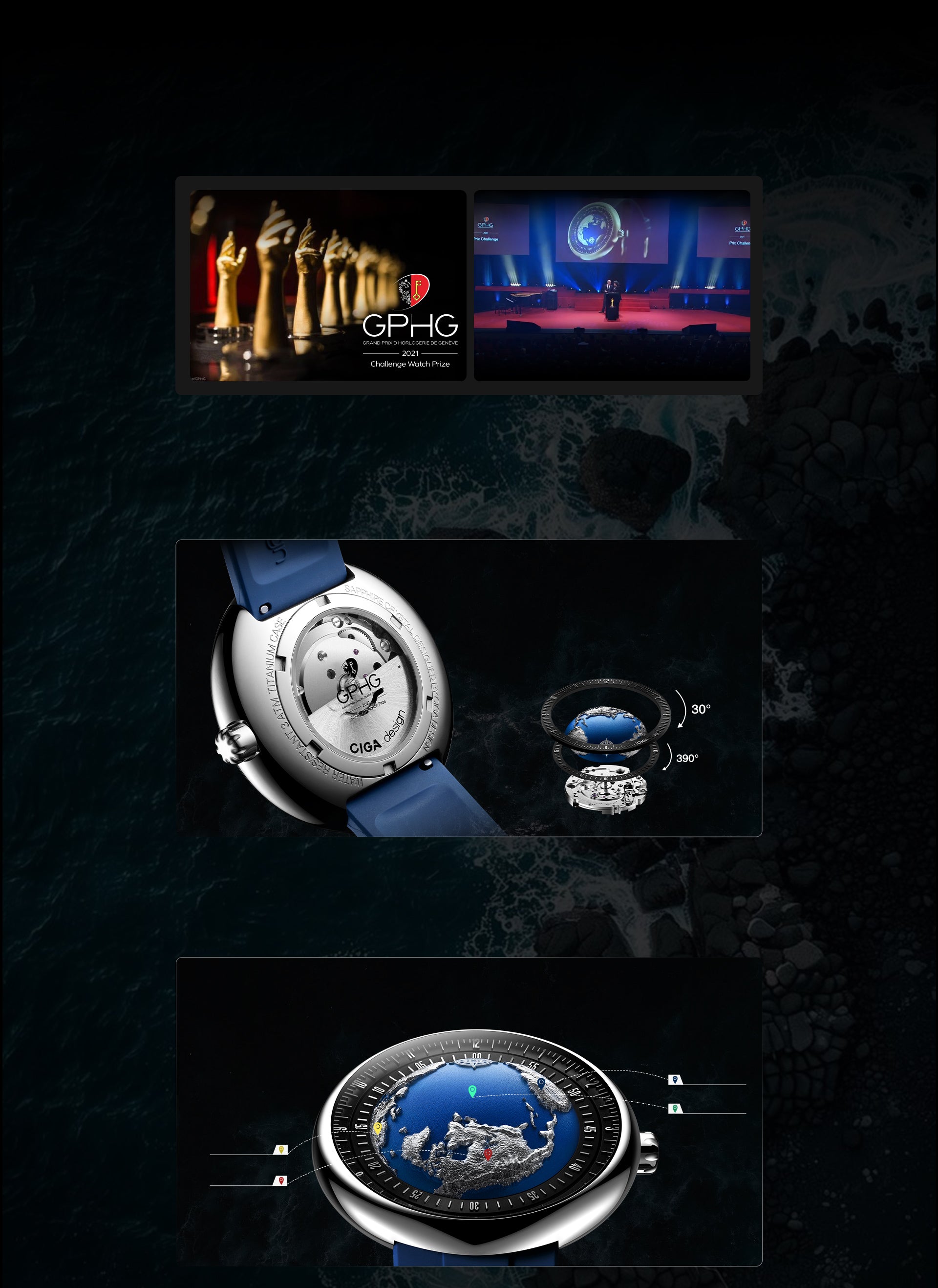 In 2021, the CIGA design Blue Planet stood out among 208 global watch entries competing for 14 prestigious awards. It earned a spot on the stage of the Grand Prix d’Horlogerie de Genève (GPHG)—the “Oscars of Watchmaking”— alongside renowned brands such as Patek Philippe and Piaget.