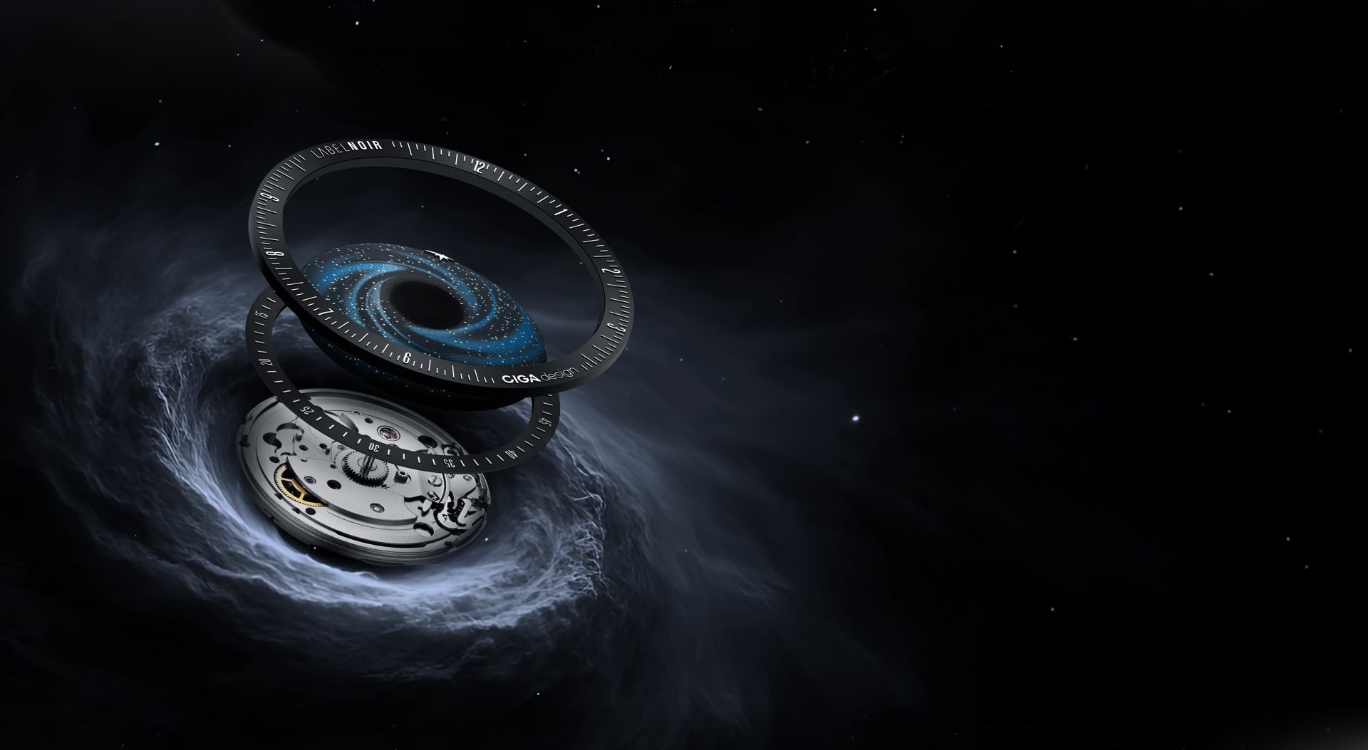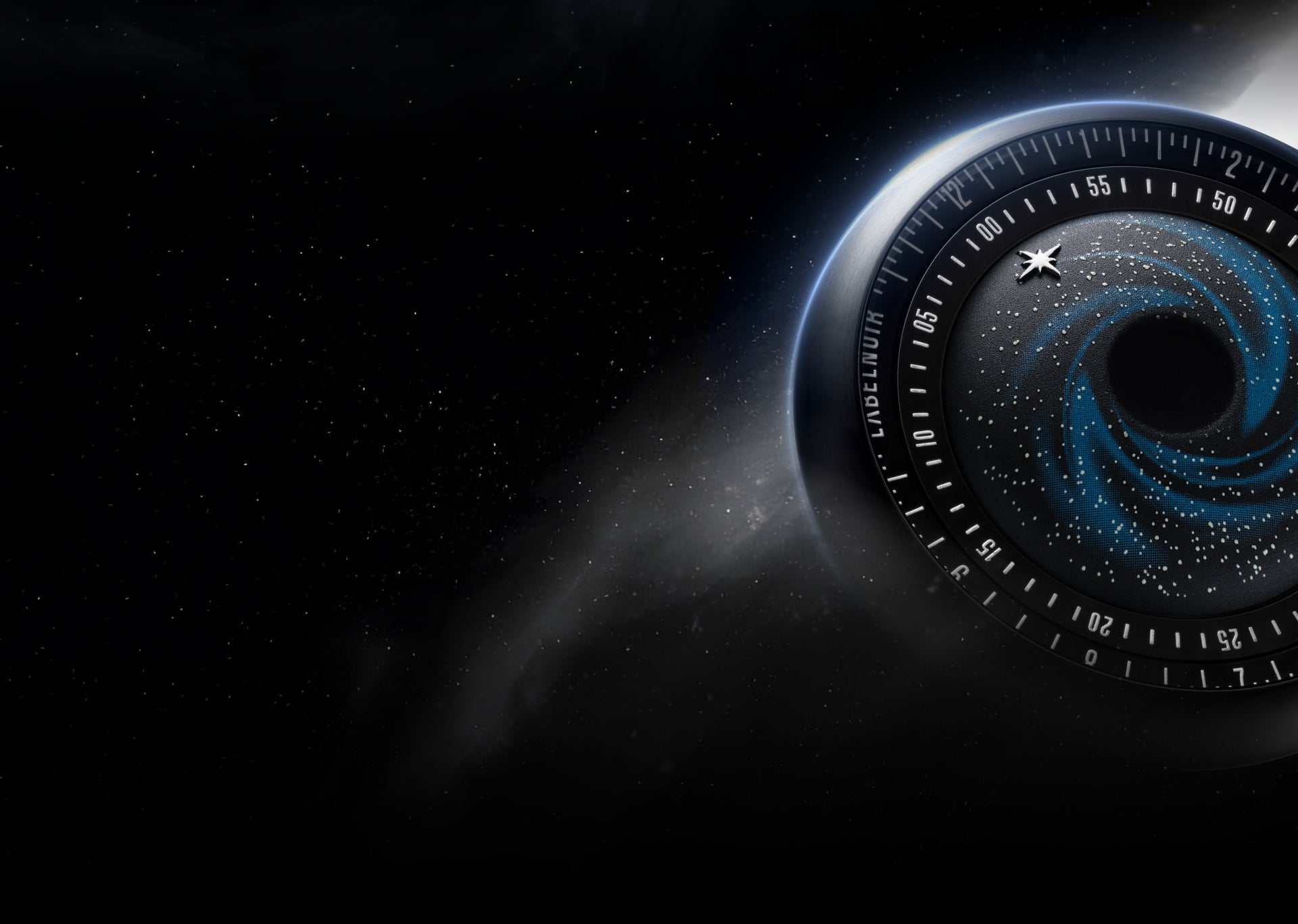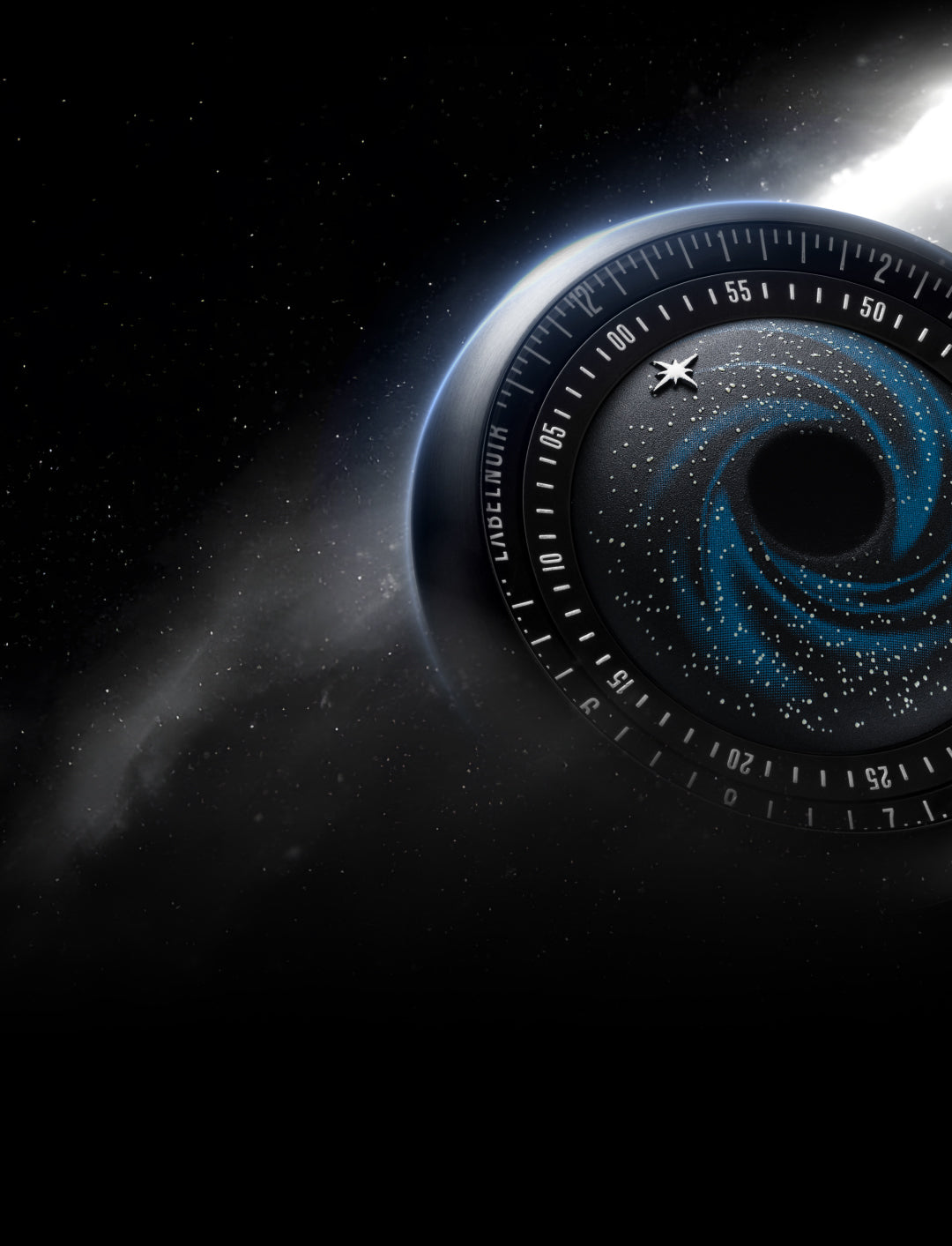 forged through precision. A black hole–inspired pit, CNC-machined and coated in light-absorptive Super Black creates a void. Around it, wisps of blue and scattered white stars trace the motion of a distant galaxy. A luminous polar-star hand orbits above, guiding time through the darkness.