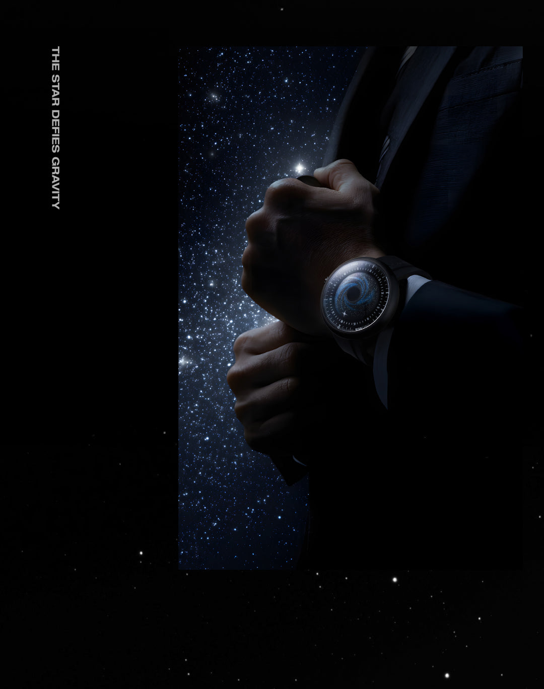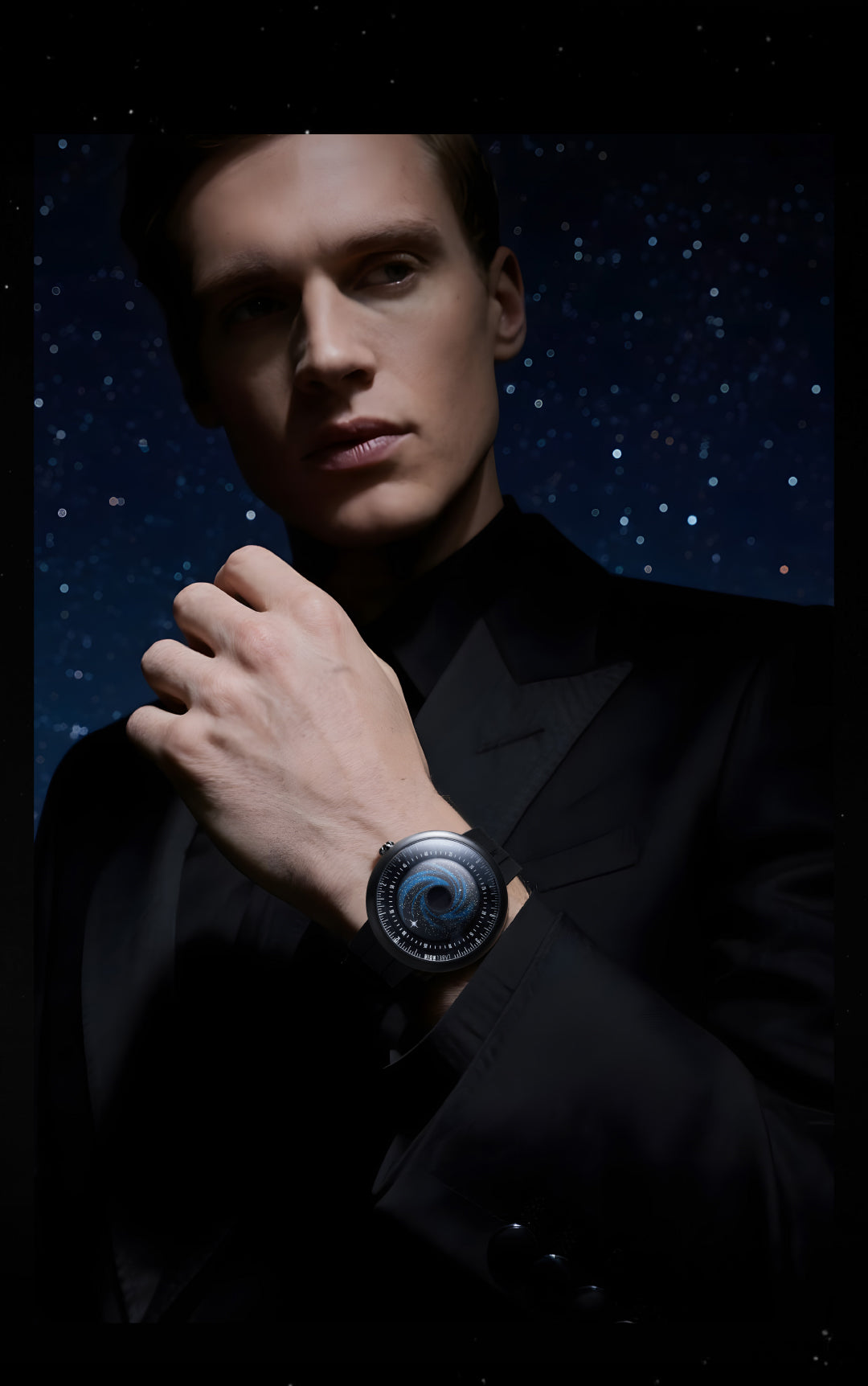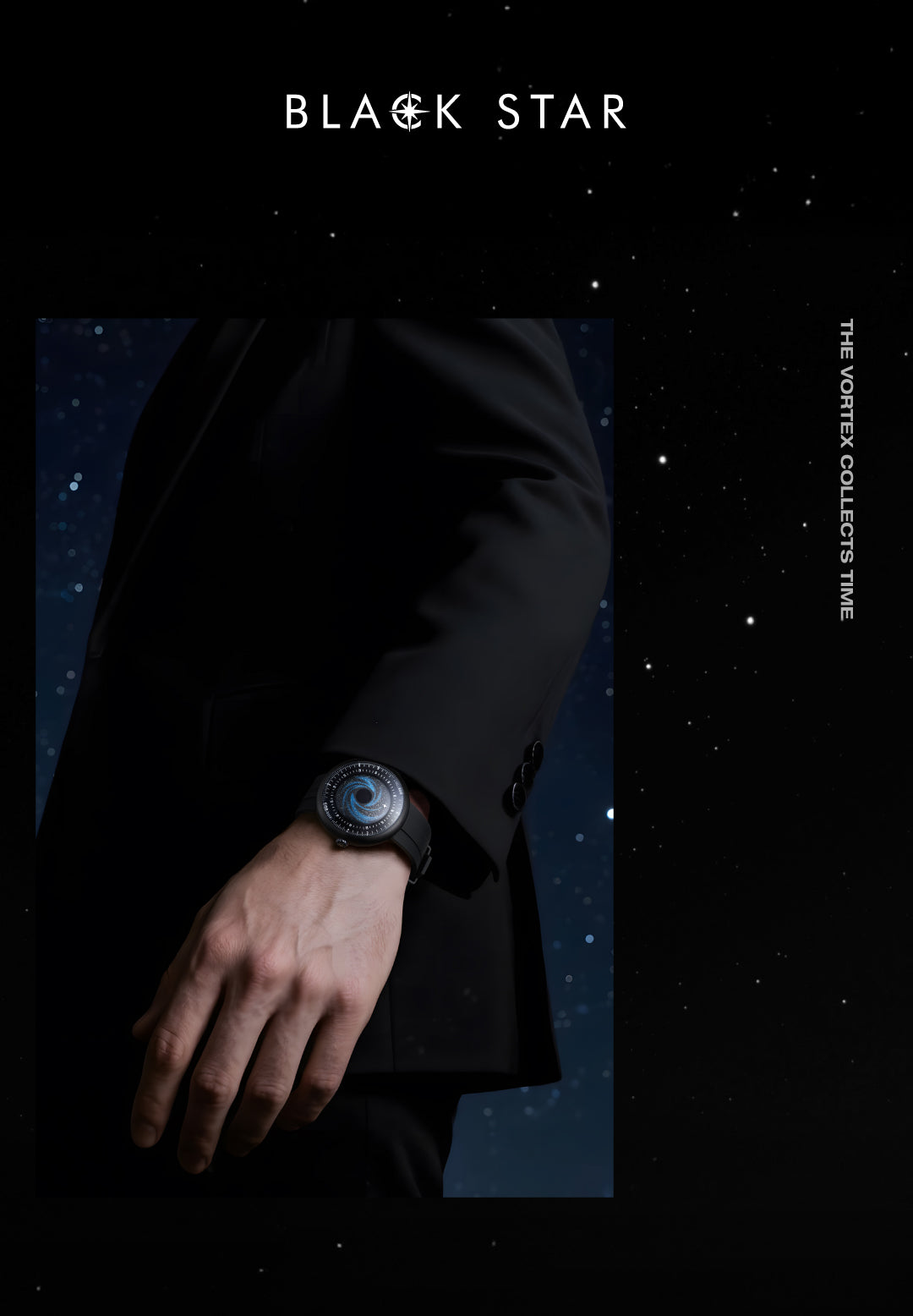 forged through precision. A black hole–inspired pit, CNC-machined and coated in light-absorptive Super Black creates a void. Around it, wisps of blue and scattered white stars trace the motion of a distant galaxy. A luminous polar-star hand orbits above, guiding time through the darkness.